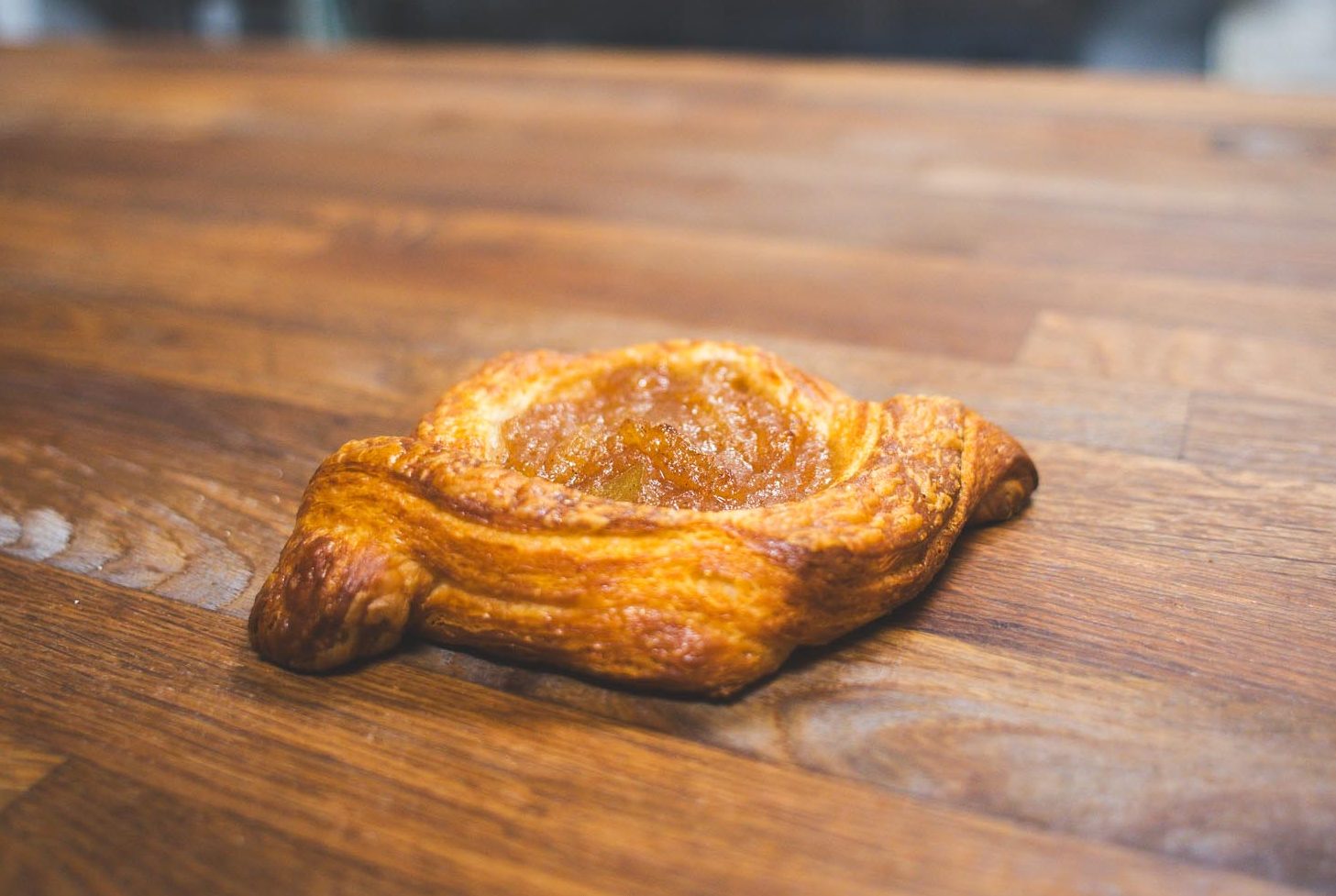 Apple Danishes are made completely in-house with organic bread flour and butter. Mixed, rolled, laminated and shaped, proofed and baked. This unique laminated dough is folded over to hold a delicious Bush Order Provisions apple jam made from Canadian apples.